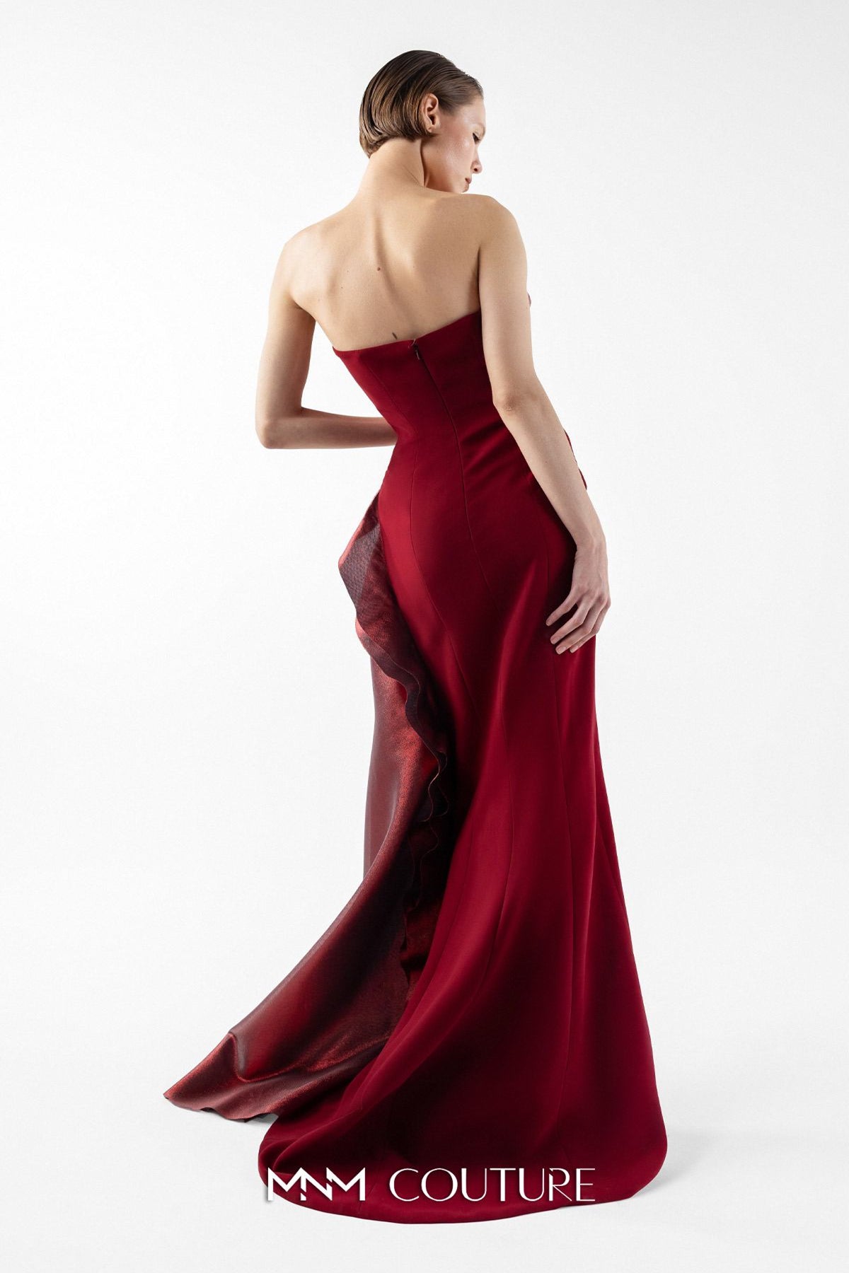 Step into a world of elegance with the MNM Couture G2037, a stunning long dress meticulously crafted for those special evening occasions. The luxurious crepe fabric hugs your silhouette in all the right places, while the exquisite ruched detailing creates a mesmerizing flow that enhances your every movement. Featuring a daring slit and a chic strapless neckline, this fitted gown highlights your radiance, making it the perfect choice for a mother of the bride or any couture event. The design is completed with a discreet zipper at the back, ensuring a flawless fit. Elevate your evening with this sophisticated piece that speaks of unrivaled craftsmanship and timeless style.