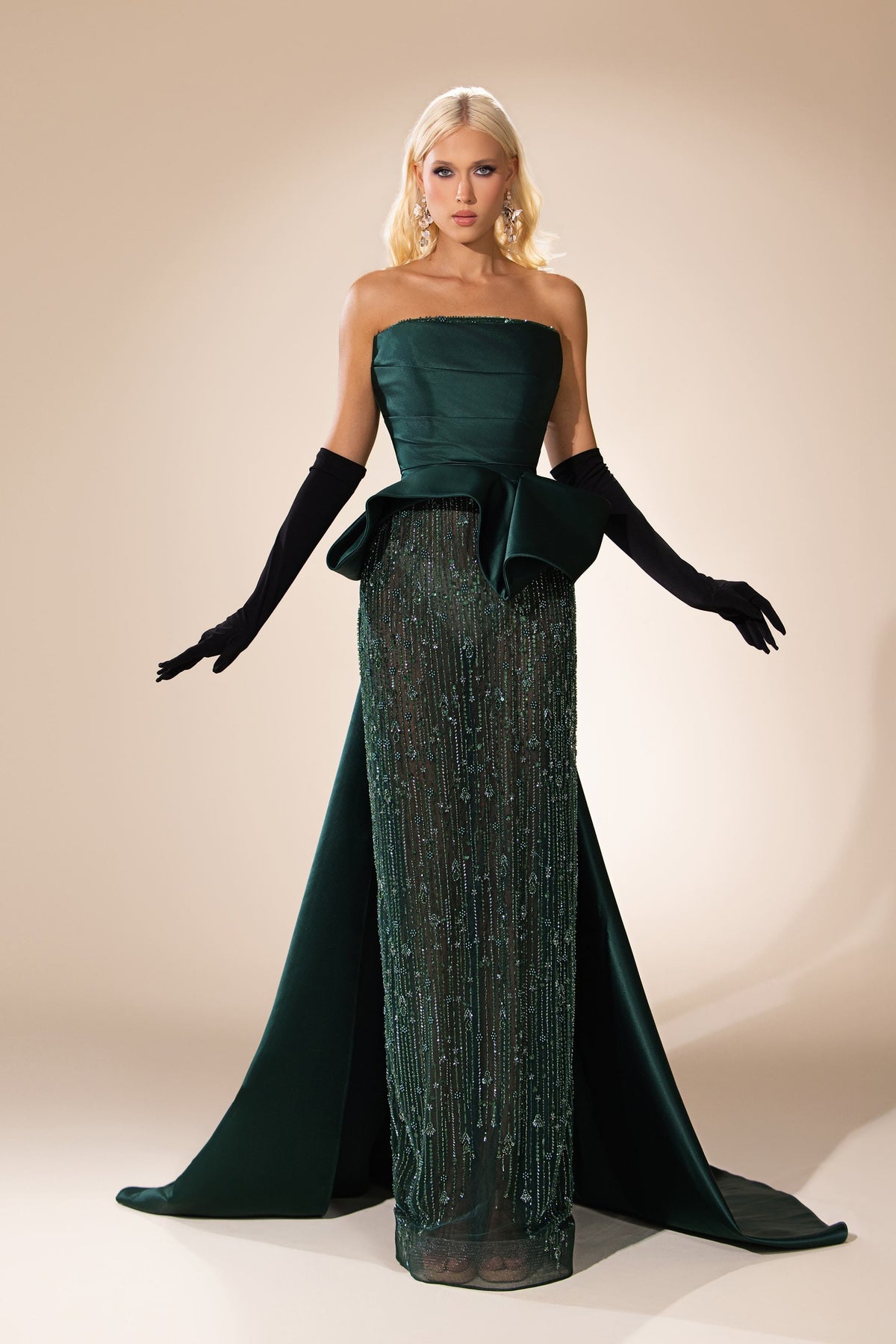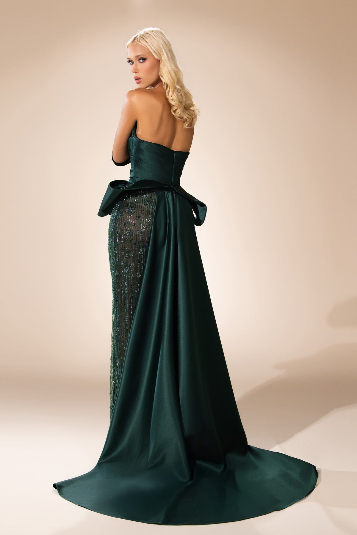 Introducing the Abdo Aoude SS26-16, a masterpiece of evening elegance. Crafted from sumptuous satin and adorned with delicate beading, this floor-length mermaid gown is designed to elevate your formal occasions. The straight-across neckline and strapless silhouette exude confidence, while the open back adds a whisper of allure. A stunning train flows gracefully behind, and a daring slit adds an unexpected touch of sophistication. Ruching details enhance the figure, making this couture piece a celebration of femininity and style, perfect for the discerning fashionista seeking to make a statement.