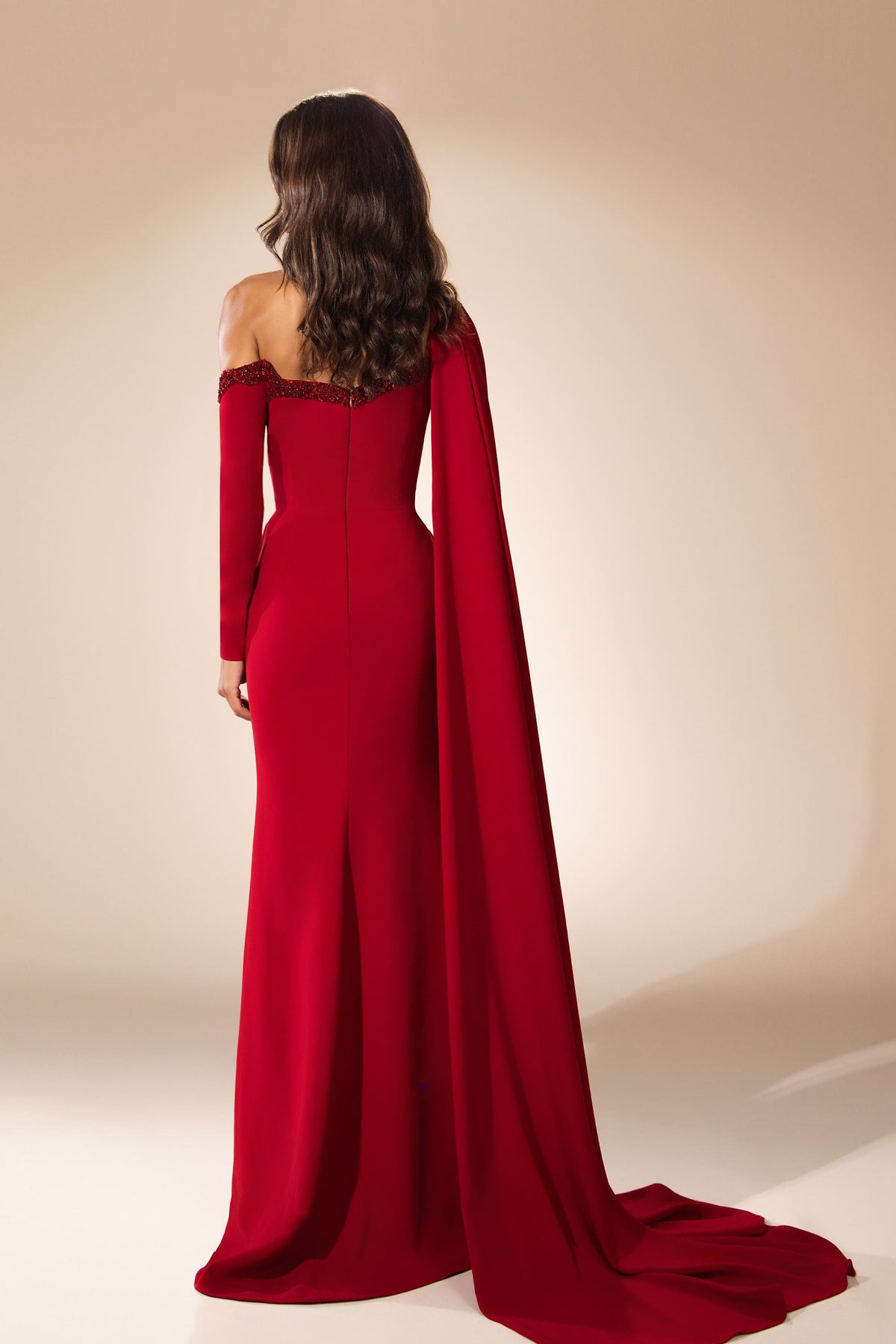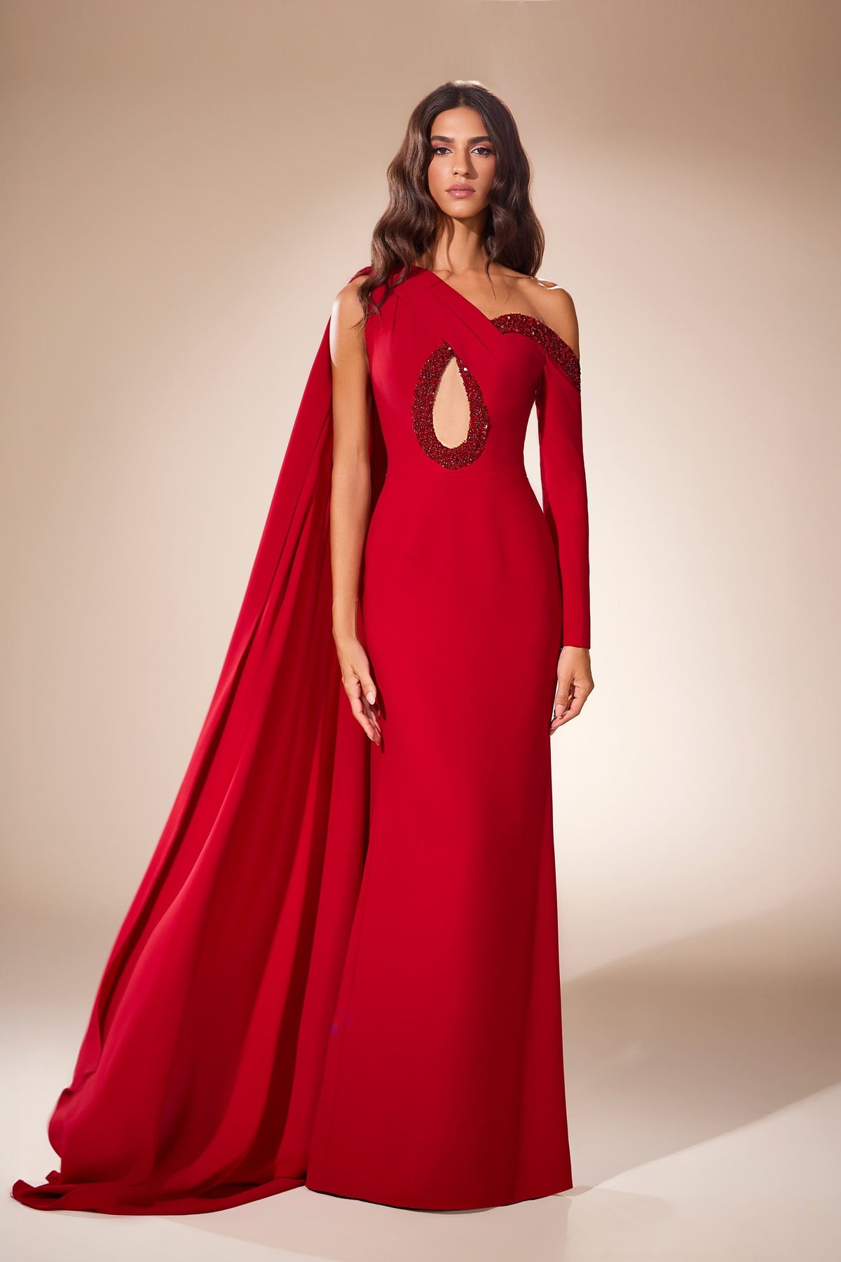 Step into a realm of exquisite elegance with the Abdo Aoude SS26-19 gown, a masterpiece crafted from luxurious silk and satin. This stunning floor-length silhouette embraces the figure with its fit-and-flare design, accentuated by a captivating one-shoulder sleeve that drapes gracefully. The enchanting keyhole neckline, adorned with intricate beading, reveals just the right amount of allure, while daring cutouts add a modern twist to timeless sophistication. The open back invites intrigue, making it a perfect choice for formal evenings where you wish to leave an unforgettable impression.