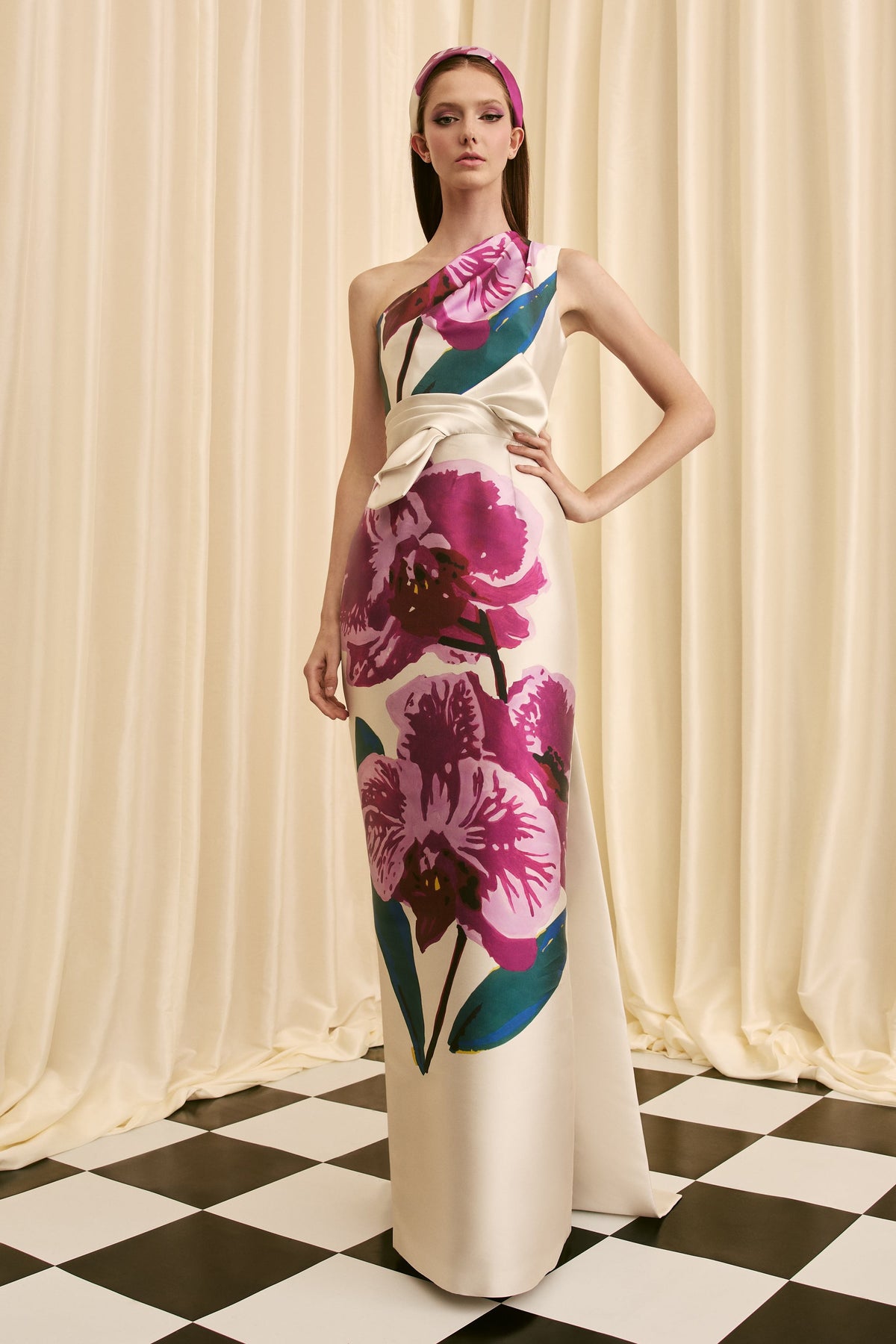 One shoulder gown . Draped bodice and assymetrical bow detail . Column skirt silhouette with back vent and detachable train . Hidden back zipper . Satin lined. Fabric: 85% POLYESTER, 15% SILK