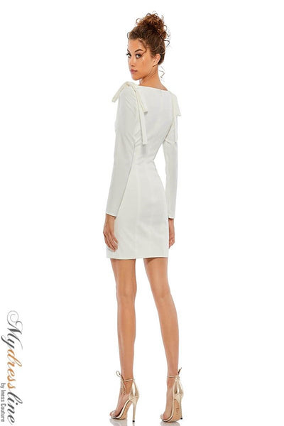Step into an evening of unparalleled elegance with the Mac Duggal 26643, a masterful blend of sophisticated design and luxurious crepe fabric that caresses your silhouette. This short, column-fitted dress features a romantic sweetheart neckline and graceful long sleeves, sculpting your form with refined precision. The delicate bow detail at the waist introduces an enchanting charm, offering a distinctive flourish that elevates your ensemble with subtle whimsy. Tailored with a sleek zipper back for a seamless fit, this piece is the perfect choice for cocktail parties and elegant soirées where your style speaks volumes. Embrace the allure of Mac Duggal and captivate every room with timeless poise.