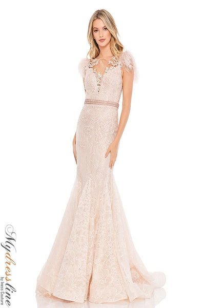 Step into a world of refined elegance with the Mac Duggal 79230 evening dress. Crafted from delicate lace, this long, mermaid-style gown beautifully contours your silhouette, highlighting your natural curves with a fitted design. The illusion and V-neckline blend sensuality with sophistication, while intricate beadwork and feather accents add a mesmerizing touch of drama. The graceful train follows your every step, creating an unforgettable presence at any formal occasion. Designed with a discreet zipper back for seamless comfort, this sleeveless masterpiece is perfect for the mother of the bride looking to captivate with timeless allure and luxurious craftsmanship.