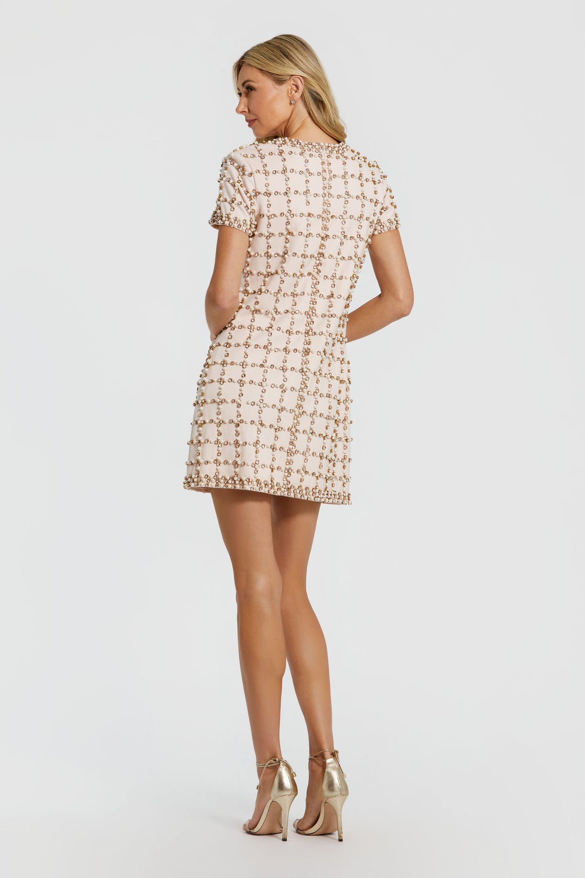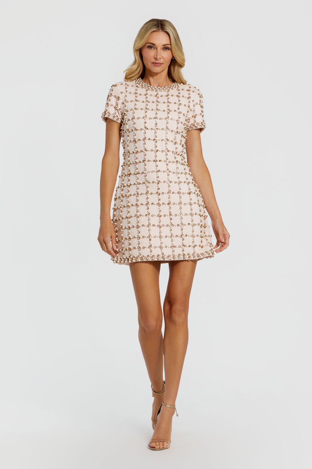 Indulge in the enchanting allure of the Mac Duggal 94036 cocktail dress, where opulence meets contemporary elegance. Crafted from a sumptuous silk-blend fabric, this exquisite mini dress showcases intricate beading and embroidery that glimmers with every movement. The flattering fit-and-flare silhouette accentuates your figure, while the round neckline and short sleeves add a touch of sophistication. Perfect for cocktail soirées and upscale parties, the concealed zipper back ensures a seamless fit, allowing you to dance the night away in style. Embrace your inner glamour and make a statement that lingers long after the night ends.