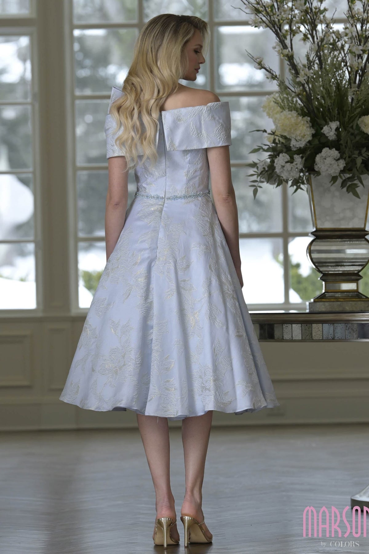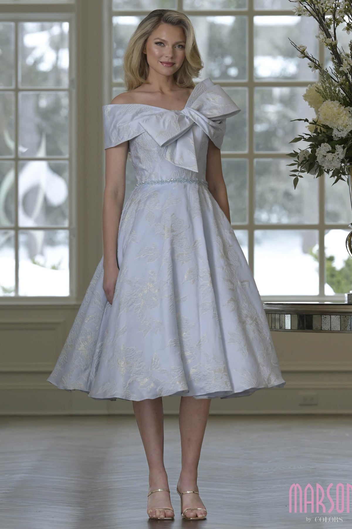Indulge in the enchanting elegance of the Marsoni MV1412, a breathtaking tea-length gown crafted from sumptuous satin and delicate lace. The off-shoulder sweetheart neckline gracefully frames the collarbone, while a striking bow detail adds a touch of whimsy and sophistication. Designed with an A-line silhouette, this exquisite dress features convenient pockets, ensuring both style and practicality. Perfect for evening soirées, bridal events, or as a stunning choice for the mother of the bride, this gown encapsulates timeless beauty and modern luxury, making it a must-have for any formal occasion.