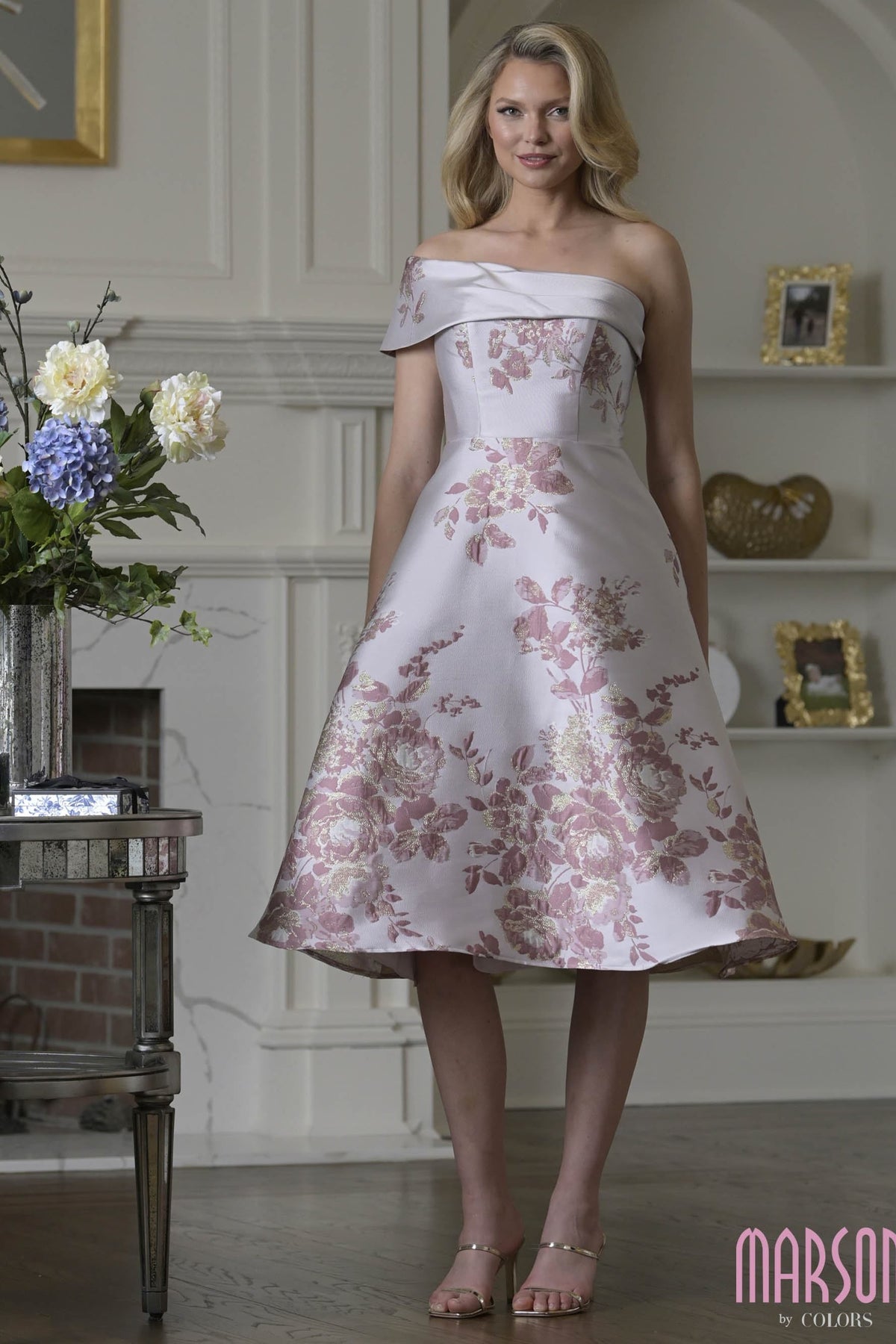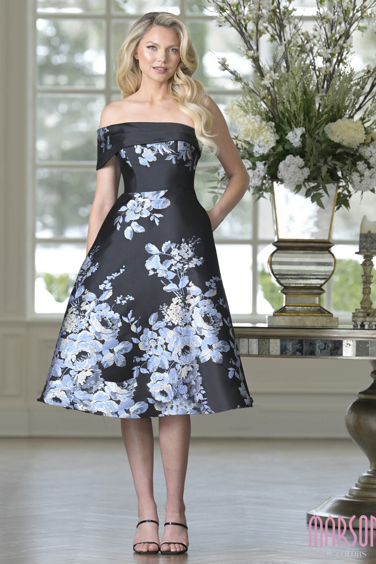 Step into an evening of elegance with the Marsoni MV1415 dress, a stunning fusion of satin and lace that embodies sophistication. The off-shoulder neckline elegantly frames the décolletage, while the exquisite floral embroidery dances across the fabric, celebrating femininity in every stitch. Designed for the discerning mother of the bride or cocktail soirée, the tea-length A-line silhouette exudes grace and poise. With a convenient zipper back and sleeveless design, this dress promises effortless allure. Elevate your formal wardrobe with this masterpiece that captures the essence of timeless glamour and refined style.