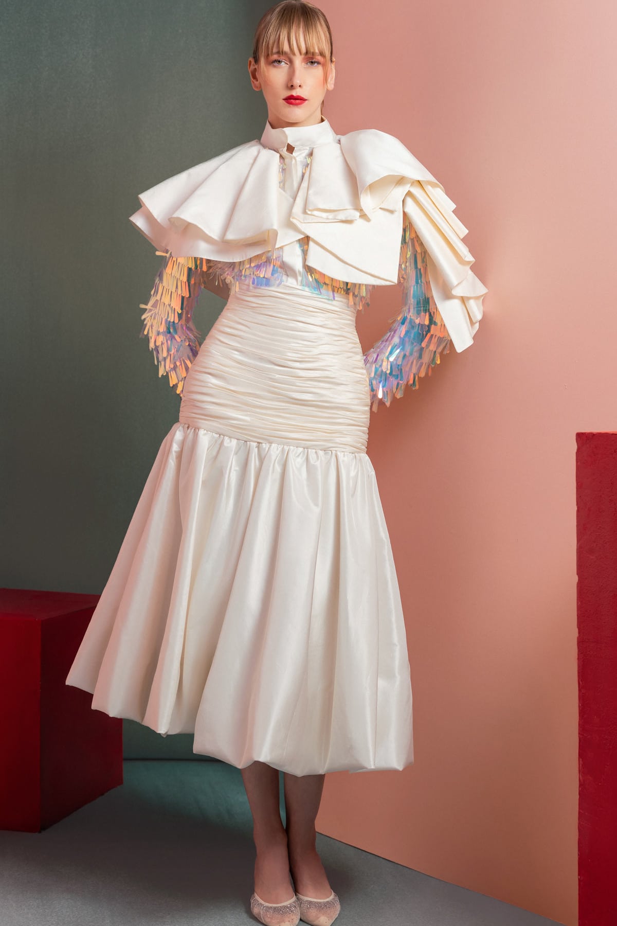 - Details: Ruching, Tiered, Cape
