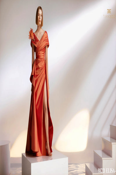 Elevate your evening allure with the Tarik Ediz 98221, a refined column-style gown crafted from sumptuous taffeta that gracefully skims your silhouette. The V-neckline and off-the-shoulder sleeves invite a romantic air, while the daring side skirt slit adds a contemporary edge that enhances your every step. Adorned with a meticulously beaded train, this long dress radiates opulence and captures the light with every movement. The discreet zipper back ensures a flawless fit, blending comfort with sophistication. Designed to turn heads at any exclusive gathering, this Tarik Ediz masterpiece transforms you into the epitome of timeless elegance and modern glamour.